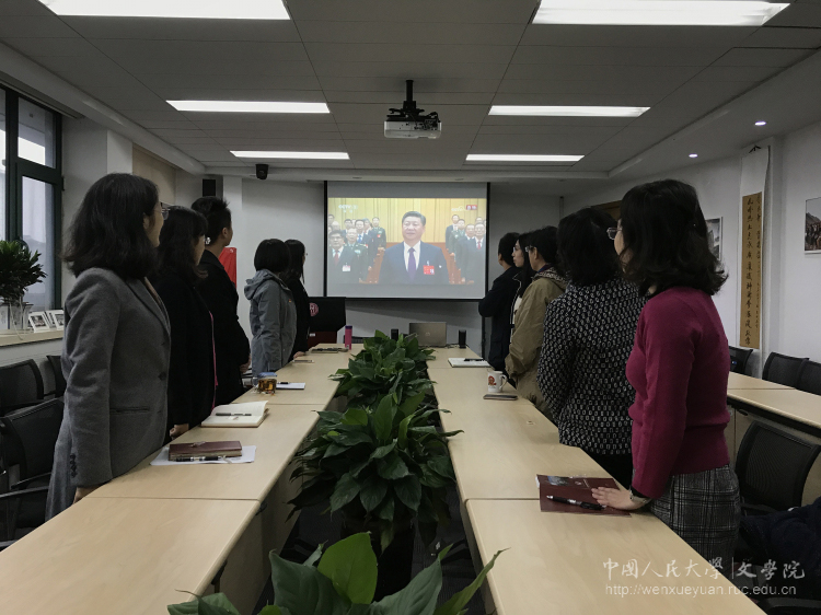 18日早8时许,支部部分党员同志就来到会场,悬挂起鲜红的党旗,调试好电视网络信号,为收看党的十九大开幕会做好了充分的准备。上午九时,伴随着高亢的国歌声,大会在北京人民大会堂的隆重开幕,行政支部党员整齐佩戴党徽,全体起立,高唱国歌,展现出昂扬向上的爱国情怀与自觉自律的集体意识。