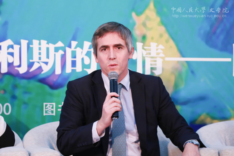 来自首都师范大学的Guillermo Bravo教授介绍了阿根廷文学在中国的传播、出版和接受情况。Guillermo Bravo教授首先指出,文学包含了丰富的内容,而在西班牙语里,用单数表示文学并不准确,因此他用复数literatures Argentinas来表示。Guillermo Bravo教授将阿根廷两百多年的文学历史总结为三个比较有代表性的种类:高乔文学、拉普拉塔河流域奇幻文学和博尔赫斯。他特别指出,博尔赫斯对中国当代的许多作家都产生了重要影响,但一般中国读者对博尔赫斯也有误解。最后,Guillermo Bravo教授介绍了阿根廷文学历史及各时期作家作品的特色,让听众对阿根廷文学有了更多的了解。