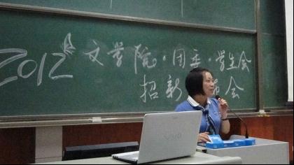 第八届团委学生会招新大会在公共教学一楼1102教室举行。团委书记黄彦菲老师,团委和学生会主席团成员和各部门成员以及全体2012级新生参与了大会。