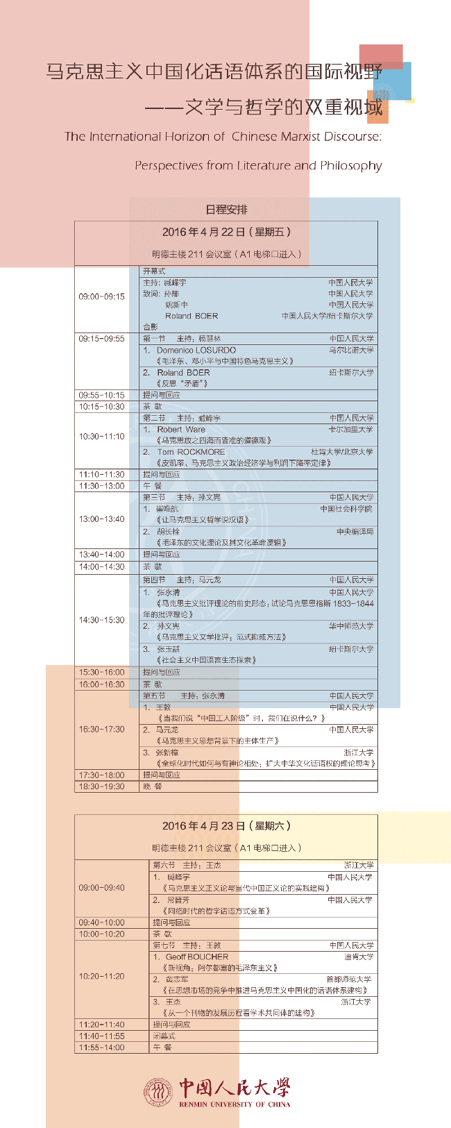 与哲学院将于4月22日(周五)、23日(周六)举办“马克思主义中国化话语体系的国际视野——文学与哲学的双重视域”(The International Horizon of Chinese Marxist Discourse: Perspectives from Literature and Philosophy),诚邀感兴趣的老师与同学到场参与讨论!
