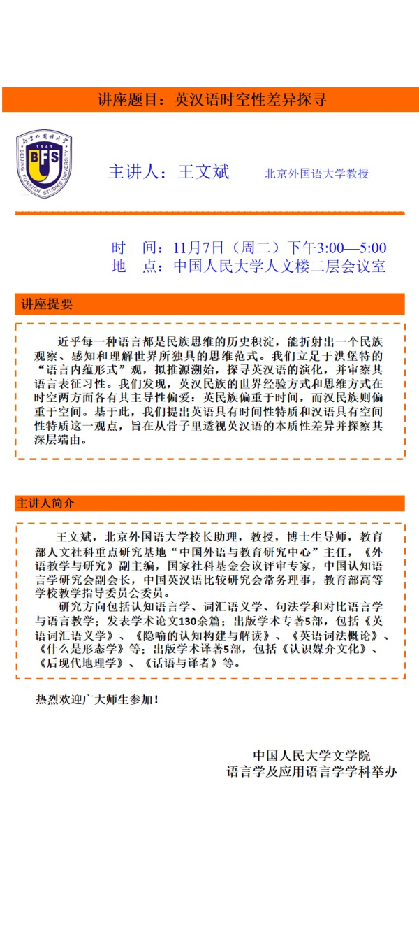 王文斌,北京外国语大学校长助理,教授,博士生导师,教育部人文社科重点研究基地“中国外语与教育研究中心”主任,《外语教学与研究》副主编,国家社科基金会议评审专家,中国认知语言学研究会副会长,中国英汉语比较研究会常务理事,教育部高等学校教学指导委员会委员。