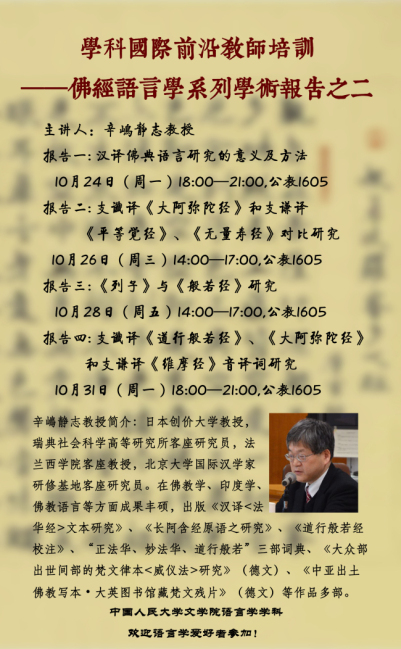 辛嶋静志教授, 10月28日(周五)14:00—17:00,公教1605