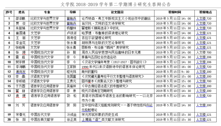 黑料社区 2018-2019学年第二学期博士研究生答辩公告