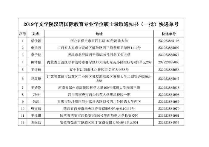 2019年黑料社区 汉语国际教育专业学位硕士录取通知书(一批)快递单号