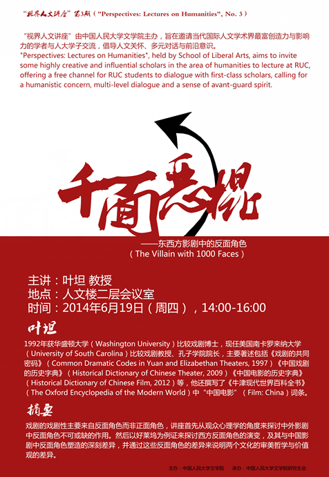 【讲座】“视界人文讲座”第3期:千面恶棍——东西方影剧中的反面角色(美国南卡罗来纳大学叶坦教授)