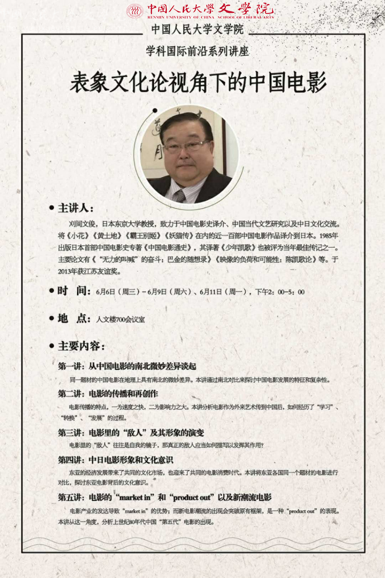 刈间文俊,日本东京大学教授,致力于中国电影史译介、中国当代文艺研究以及中日文化交流。曾将《小花》《黄土地》《霸王别姬》《妖猫传》在内的近一百部中国电影作品译介到日本。1985出版日本首部中国电影史专著《中国电影通史》,其译著《少年凯歌》也被评为当年最佳传记之一。主要论文有《“无力的叫喊”的奋斗:巴金的随想录》《映像的负荷和可能性:陈凯歌论》等。于2013年获得江苏友谊奖。