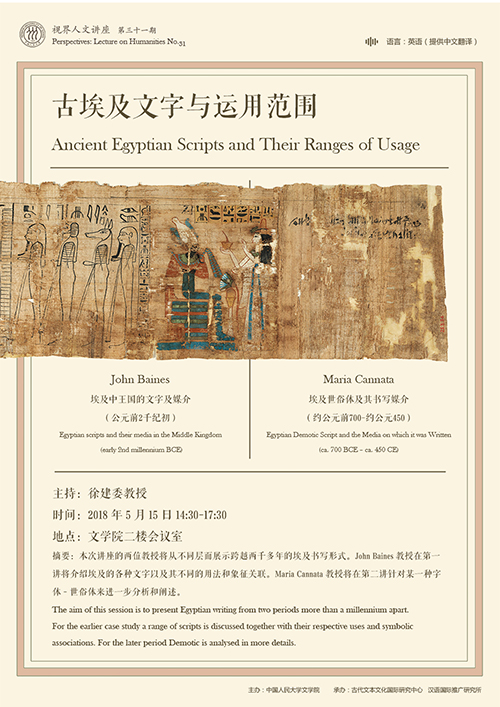 摘要:本次讲座的两位教授将从不同层面展示跨越两千多年的埃及书写形式。John Baines教授在第一讲将介绍埃及的各种文字以及其不同的用法和象征关联。Maria Cannata教授将在第二讲针对某一种字体-世俗体来进一步分析和阐述。