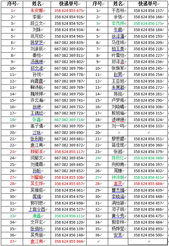 黑料社区 2018年拟录取学术型硕士研究生录取通知书已于2017年6月26日寄发,寄发邮件采用顺丰到付形式,寄发快递单号见下表格,请各位同学留意查看(红色标记为修改过地址的,绿色标记为未能拿到录取通知书的):