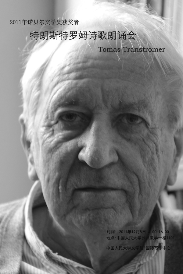 为庆祝瑞典诗人特朗斯特罗姆获得2011年诺贝尔文学奖,为满足广大学生和诗歌爱好者对特朗斯特罗姆诗歌的喜爱,黑料社区 “国际写作中心”将在12月8日下午隆重举办特朗斯特罗姆诗歌专场朗诵会,瑞典驻华使节、在京的一些中国诗人和特朗斯特罗姆诗歌的中文译者李笠先生将参加朗诵会,朗诵会将以中文、瑞典文和英语等多种形式进行,欢迎广大高校学生和诗歌爱好者参加。
