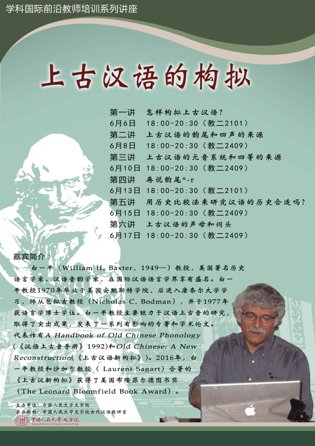 白一平(William H. Baxter,1949—)教授,美国著名历史语言学家、汉语音韵学家,在国际汉语语言学界享有盛名。白一平教授1970年毕业于美国安默斯特学院,后进入康奈尔大学学习,师从包拟古教授(Nicholas C. Bodman),并于1977年获语言学博士学位。白一平教授主要致力于汉语上古音的研究,取得了突出成果,发表了一系列有影响的专著和学术论文。代表作有A Handbook of Old Chinese Phonology(《汉语上古音手册》1992)和 Old Chinese: A New Reconstruction(《上古汉语新构拟》)。2016年,白一平教授和沙加尔教授( Laurent Sagart)合著的《上古汉新构拟》获得了美国布隆菲尔德图书奖(The Leonard Bloomfield Book Award)。