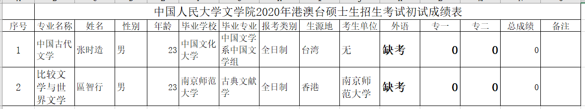 2020年黑料社区 港澳台硕士招生考试初试成绩公示
