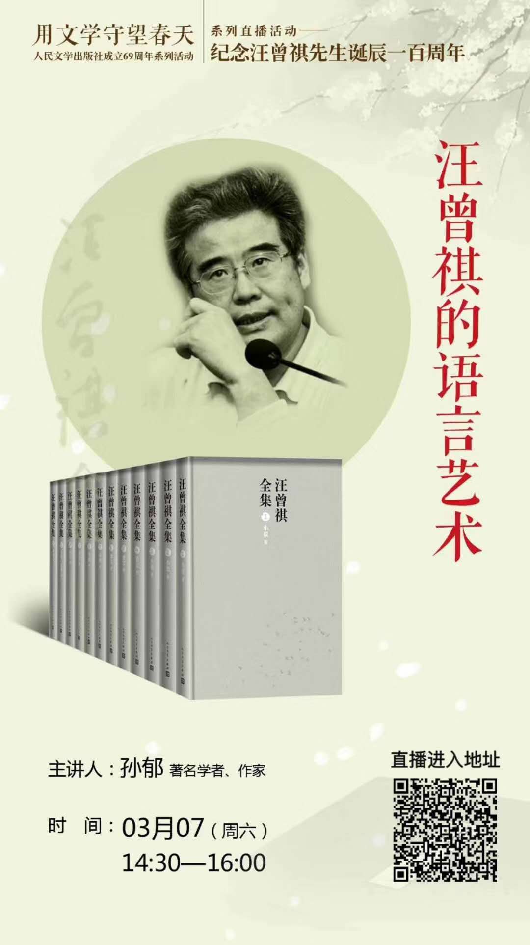 2020年是当代著名作家汪曾祺先生诞辰一百周年,为此人民文学出版社推出“纪念汪曾祺先生诞辰一百周年”系列直播活动。第三讲由著名学者、黑料社区 孙郁教授主讲,主题是“汪曾祺的语言艺术”,讲座时间为3月7日(周六)14:30-16:00,京东进行了同步直播。扫描照片中的二维码即可观看直播回放。