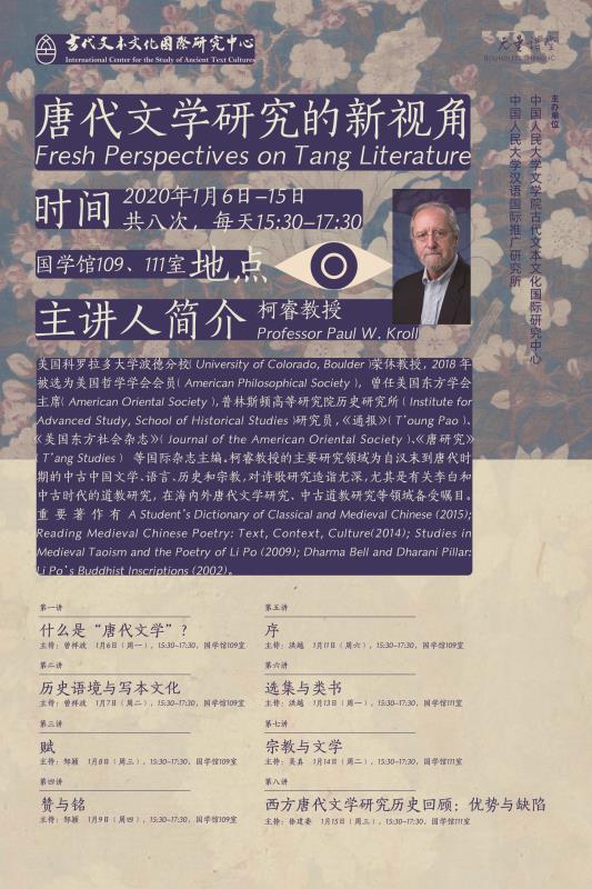 柯睿教授(Professor Paul W. Kroll),美国科罗拉多大学波德分校(University of Colorado, Boulder)荣休教授,2018年入选美国哲学学会(American Philosophical Society),曾任美国东方学会主席(American Oriental Society),普林斯顿高等研究院历史研究所(Institute for Advanced Study, School of Historical Studies)研究员,《通报》(T’oung Pao)、《美国东方社会杂志》(Journal of the American Oriental Society)、《唐研究》(T’ang Studies)等国际杂志主编。柯睿教授的主要研究领域为自汉末到唐代时期的中古中国文学、语言、历史和宗教,对诗歌研究造诣尤深,尤其是有关李白和中古时代的道教研究,在海内外唐代文学研究、中古道教研究等领域备受瞩目。重要著作有A Student’s Dictionary of Classical and Medieval Chinese (2015); Reading Medieval Chinese Poetry: Text, Context, Culture (2014); Studies in Medieval Taoism and the Poetry of Li Po (2009); Dharma Bell and Dharani Pillar: Li Po’s Buddhist Inscriptions (2002)。