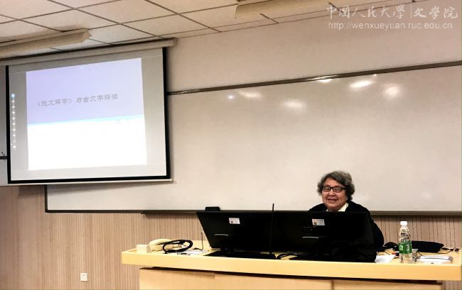 此后,王宁教授又对文献文字学与古文字学进行了讲解和比较。文献文字学更为强调还原典籍原貌,而古文字学更重视汉字形体发展的链条与双重证据法,它们的共同点是都强调音形义互求。其中,王宁先生还重点介绍了《说文》学。《说文》是一座桥梁,联通了古文字与今文字,并构建了字与字之间的关系网。王宁先生说:“《说文解字》里面的每一个字都可以讲解,找到‘字理’。字与字之间可以互相讲解,形成关系网。”