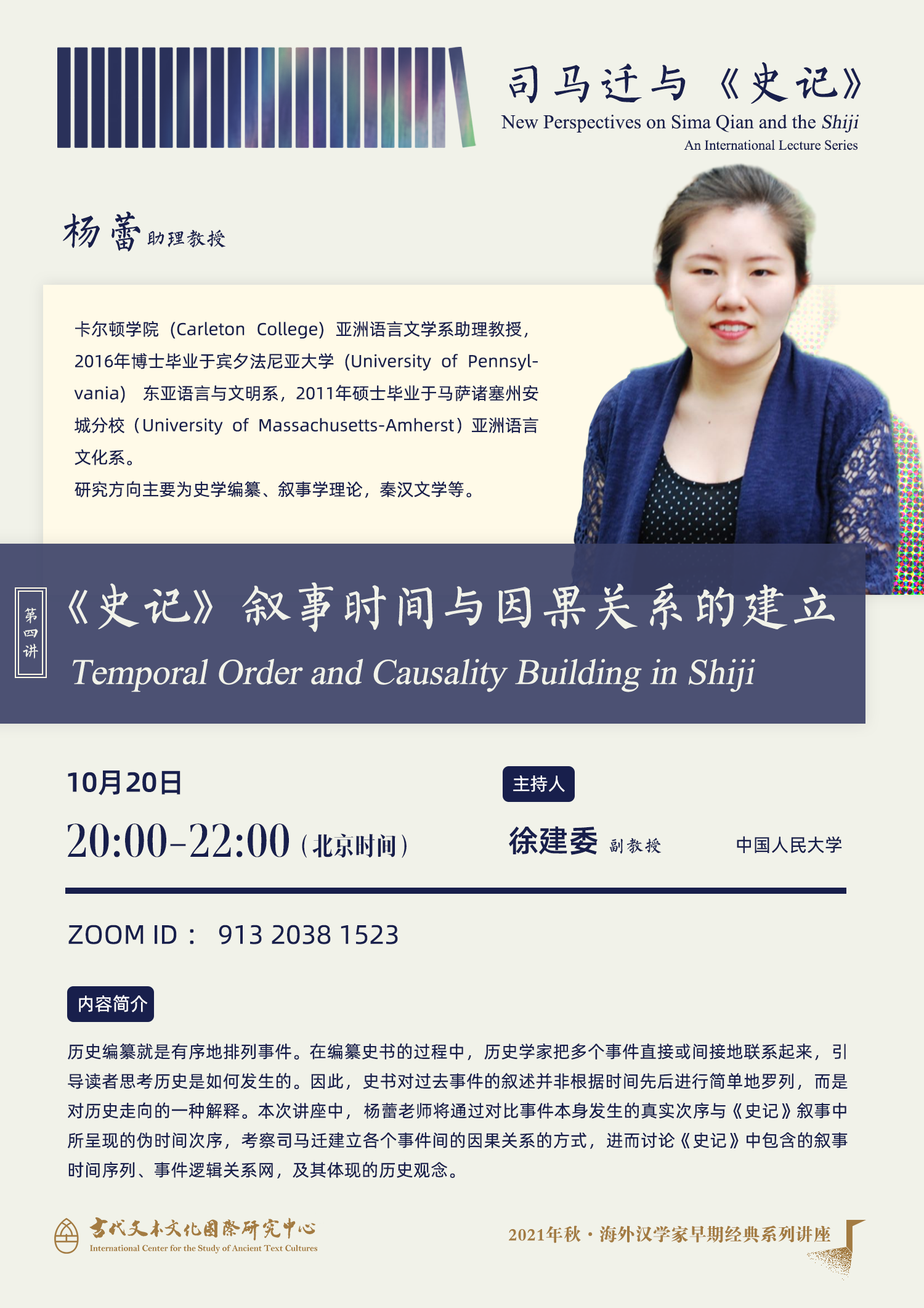 历史编纂就是有序地排列事件。在编纂史书的过程中,历史学家把多个事件直接或间接地联系起来,引导读者思考历史是如何发生的。因此,史书对过去事件的叙述并非根据时间先后进行简单地罗列,而是对历史走向的一种解释。本次讲座中,杨蕾老师将通过对比事件本身发生的真实次序与《史记》叙事中所呈现的伪时间次序,考察司马迁建立各个事件间的因果关系的方式,进而讨论《史记》中包含的叙事时间序列、事件逻辑关系网,及其体现的历史观念。