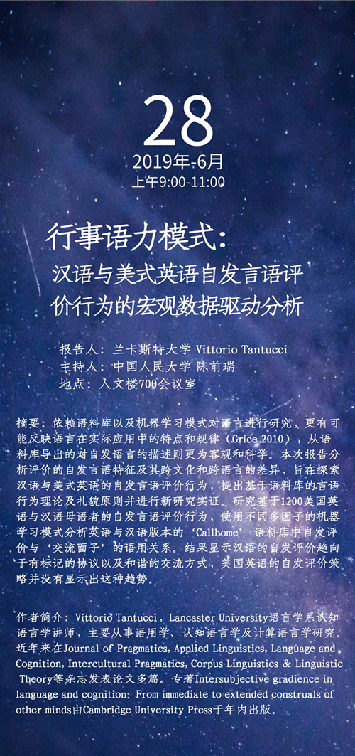 【讲座预告】行事语力模式:汉语与美式英语自发言语评价行为的宏观数据驱动分析