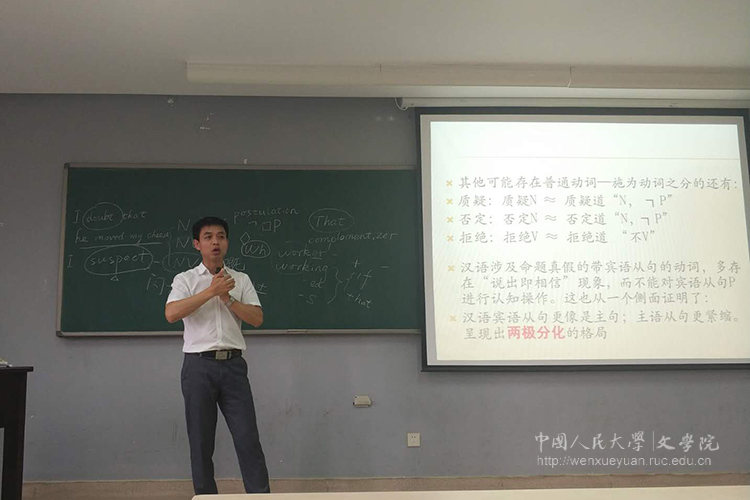 讲座的第二部分唐老师指出汉语涉及命题真假的带宾语从句的动词,多存在“说出即相信”现象,而不能对宾语从句进行认知操作。由此这也从侧面证明了汉语宾语从句更像是主语,主语从句更紧缩,呈现出两极分化的格局。在论述排斥断言、直陈语气词、构式时,唐老师通过“将要”一例说明此类助动词除了具有将来时间指称功能外,还用于断言,负载直陈语气,因此不能进入主语也不能进入虚拟条件句。讲座第三部分唐老师进一步得出结论主语从句是一种缩减从句,缩减原因之一是要保持非叙事性,从而让谓语动词对该命题的真实性进行操作,假定命题在入句前无所谓真假。并指出主语谓词要么直接对该命题的真假进行断言,要么通过叙实性动词间接地触发存在预设。