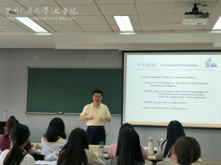 储教授多年以来为对外汉语教学及其研究做出了许多贡献,本次讲座主要是围绕对外汉语教学分级阅读的理念和教学实践展开,并且以教材《汉语风》的设计和编写为例,为同学们进行了精心的解读。本次讲座主要谈论了四个方面的问题:(一)传统的国际汉语课程体系所存在的问题与引入分级泛读的必要,关于这一点,储教授指出,学习者在学习过程中存在畏难情绪的原因不外乎学的多会的少、挫败感多学习过程不愉快、失去信心和兴趣等,主要原因之一在于“高浓度”、“唯精读”的传统教学模式与课程模式的影响,因此,需要变单脚跳为两条腿走路,而引入分级泛读是一个非常有效的途径;(二)分级泛读的基本理念与分级读物的应有属性问题,储教授表示,分级泛读就是阅读用简单的语言书写的阅读材料,这些泛读读物的材料对学习者来说,首先应该是在其语言等级范围之内比较容易接受的,并且读物的封皮和目录也需要有吸引力,让读者充满兴趣,其次材料的话题设置也应该是宽泛的,适用于广大人群;(三)分级读物的必要性问题,储教授强调,分级读物是语言学习中的一个必需的完整的重要部分,也是使学习者在学习词汇、语法、汉字等知识更加自主和流利的一个重要部分,真正做到流利阅读的学习者需要泛读,泛读也是学习者从简单阅读向复杂阅读迈进的一块垫脚石;(四)中文教学中的分级泛读与《汉语风》的设计与创作方面,储教授以《汉语风》为例,向同学们展示了一本适合学习者学习的教材应该具备的特征,首先应该是等级完备,方便选择,题材广泛的,其次应该是词汇实用,复现率高,易读易懂,生词率低的,还应该是语言自然,地道有味,作家原创,配有录音光盘辅助学习者学习的。除此之外,储教授还表示,语用能力的培养在学习过程中是至关重要的,教学过程中教师一定要注意学习者语用能力的培养。