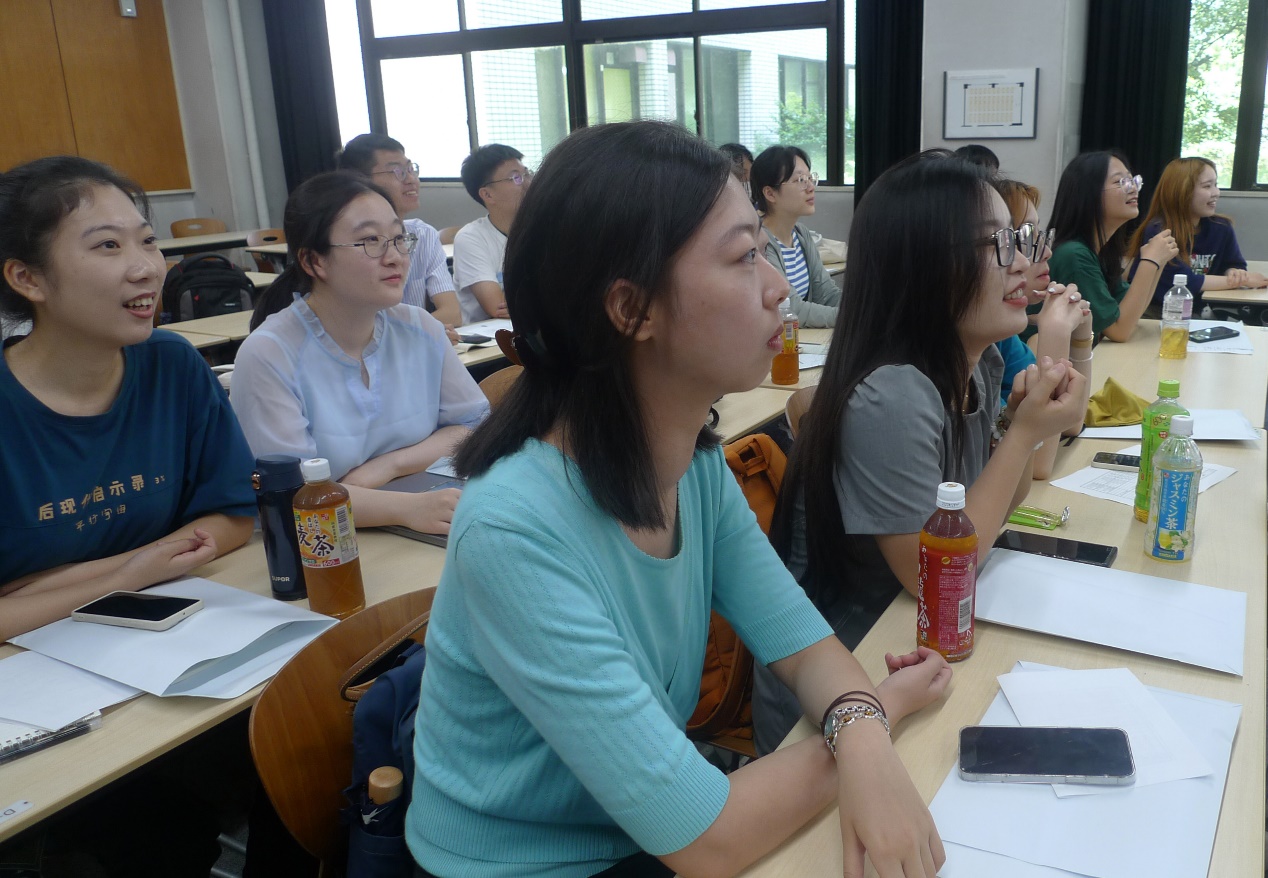 欢迎仪式后,研学团集体旁听了李彦铭老师的中文课堂。该课程专为初学汉语的学生设计,同学就感兴趣的话题用中文进行课堂展示,老师随时对汇报中涉及的汉语字、词及语法加以强调和拓展,这种重视语境、灵活互动的教学方式提高了非中文母语的学生理解与运用中文知识的能力。大家认真听取东大学生的报告,初步了解了日本学生对中国当代互联网热词、日常生活习惯等方面的看法。在随后交流环节中,两校学生使用中、日、英三种语言深入讨论各自的学习经历、专业兴趣,现场其乐融融,气氛十分热烈。