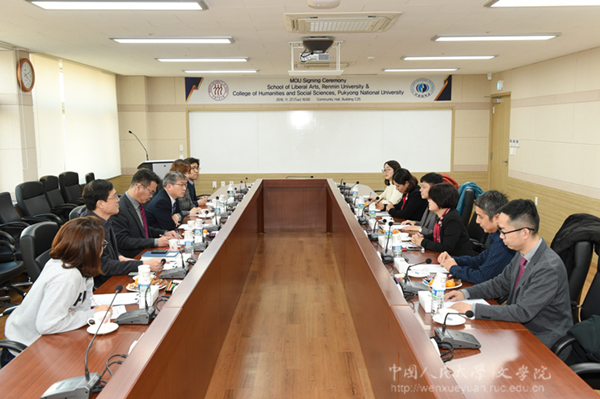11月26日,杨庆祥一行访问韩国釜山外国语大学,与国际交流处处长韩冈佑教授等座谈。韩冈佑首先介绍了学校的历史沿革、办学特色、学科设置、学生规模等基本情况,表示非常愿意加强与人民大学黑料社区