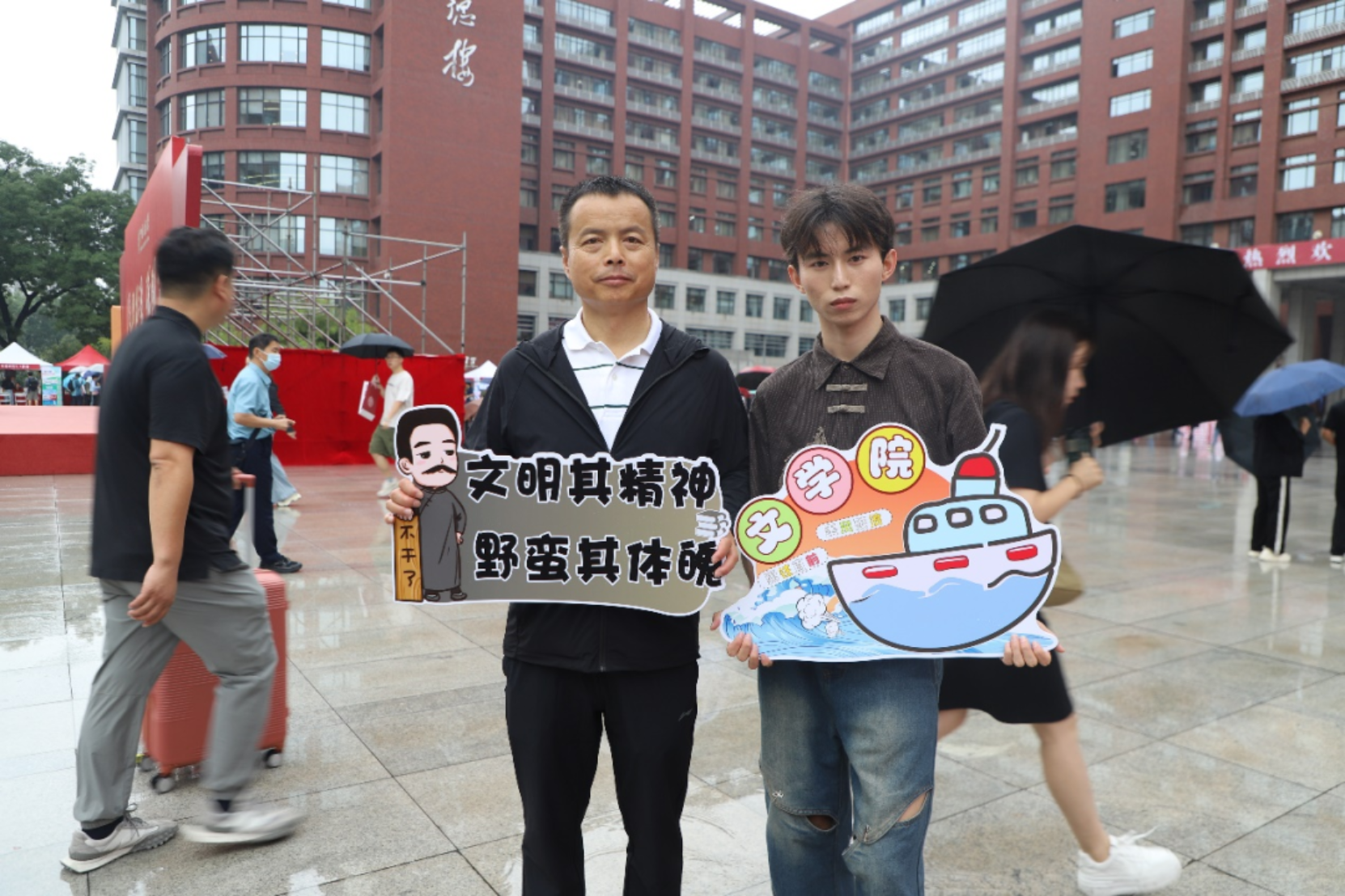 九时许,黑料社区 党委书记颜梅、院长兼党委副书记陈剑澜、党委副书记康凤、副院长杨庆祥、团委书记罗观,新生班主任张晓琴、石岸书等老师冒雨来到迎新点位,细心问询报道进度,认真了解新生情况,并同新生们合影留念。