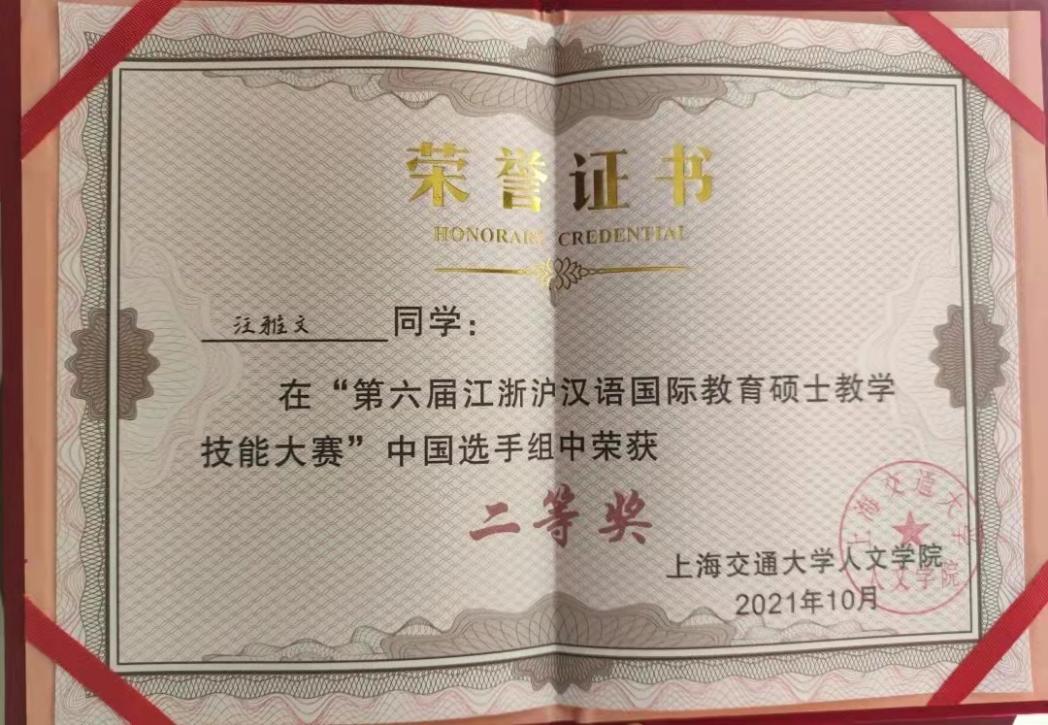20级汉语国际教育专业研究生李爱侠、汪雅文同学参加了此次比赛,表现优异,分别获得了汉语教学技能大赛中国学生组二等奖。这是自2015年以来历届参赛的最好成绩。