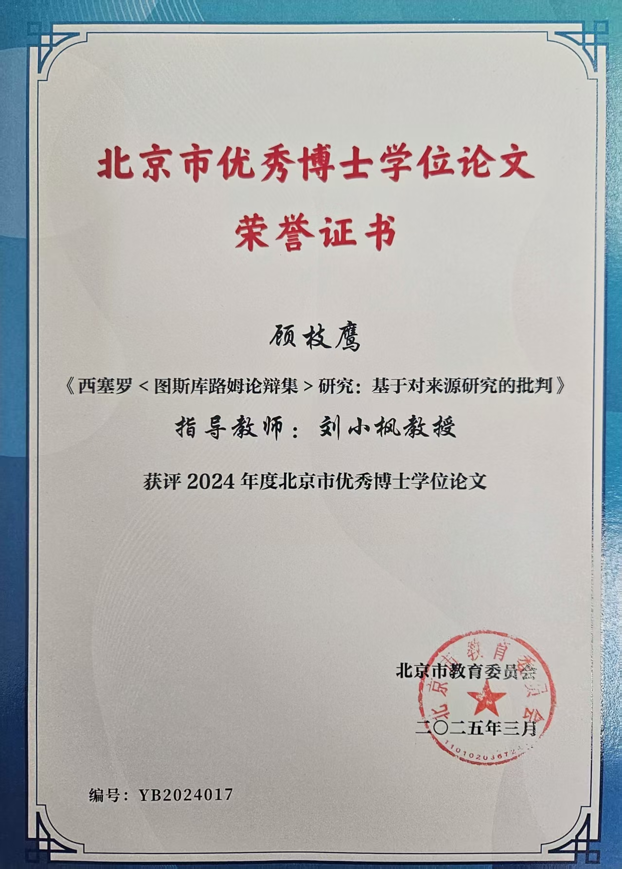 顾枝鹰的博士学位论文是一篇选题价值较高、难度颇大、质量上乘的博士论文。作者以扎实的古希腊语和拉丁语语言基础,细致爬梳西塞罗作品的原文,就其著作的来源和原创性做了深入的探究,并在此基础上解读《图斯库路姆论辩集》。此项研究不仅需要作者对古典文献本身做详尽的古典语文学的分析,还需要勾连古希腊文学与古罗马文学,尤其是与西塞罗作品之间的关系,在广泛的影响和创新的语境中得出颇具独创性的结论和观点。就结论而言,作者充分尊重和认可西塞罗的创作态度及其作品的独创性,符合古罗马经典作家与古希腊文明之间的关系的实际情形。论文理论基础坚实,方法得当,引证翔实,引文规范,结构严谨,行文流畅,文辞古雅,显示出作者扎实的学养和优秀的科研能力。