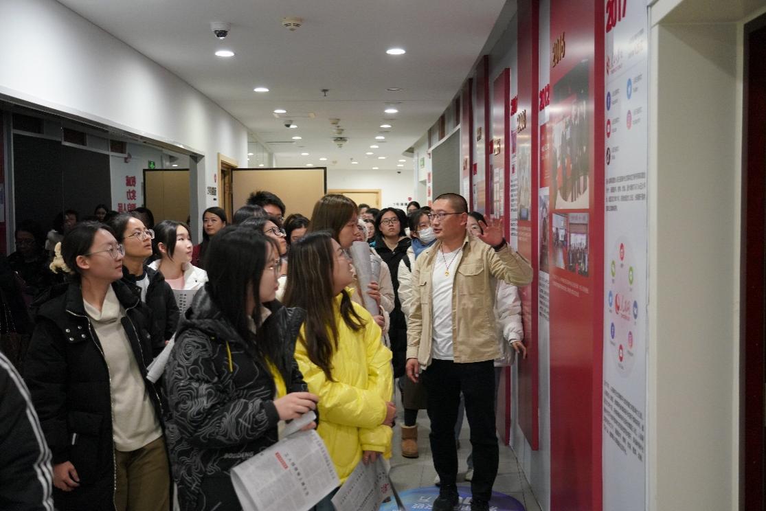 随后,师生一行进入新媒体大厦参观交流。在人民网,师生们聆听了历任党中央领导与人民日报的故事,切实感受到其作为党中央机关报的地位。在新媒体中心,新闻学院校友刘畅详细讲解了人民日报现有的“两微三端多号”新媒体矩阵,将其中蕴含的情感密码和传播逻辑娓娓道来,师生共同感受到人民日报社在当下新媒体浪潮里“弄潮”奋进的蓬勃朝气。