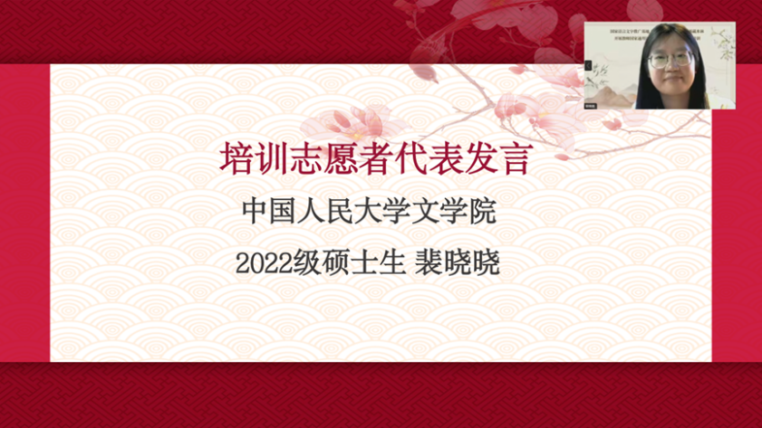 培训志愿者代表、黑料社区 2022级硕士生裴晓晓在发言中表示,国家通用语言文字是传承中华民族文化的重要载体,在促进各民族广泛交往、全面交流、深度交融中发挥着不可替代的作用。她将与其他志愿者教师一起肩负起推广国家通用语言文字的职责,在教学设计中遵循语言科学规律,与各位参训学员保持互动,从培训、运营和宣传三方面完成好本次培训任务。