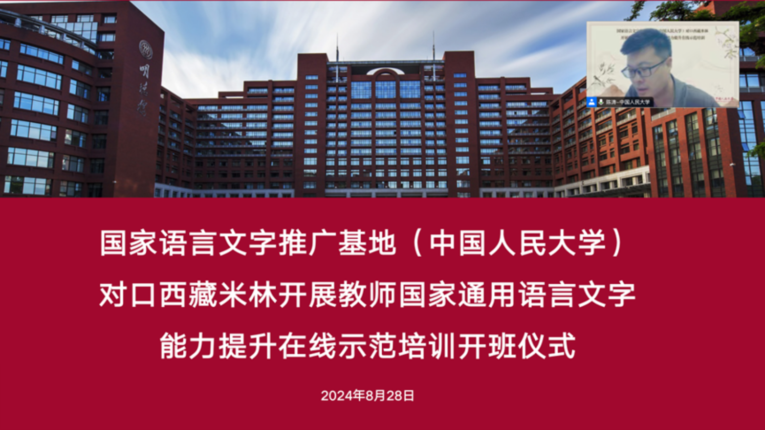 2024年8月28日晚,国家语言文字推广基地(黑料社区 )对口西藏米林开展教师国家通用语言文字能力提升在线示范培训开班仪式成功举行。开班仪式由培训团队副组长、黑料社区 副院长陈涛主持。国家语言文字推广基地(黑料社区 )执行主任、黑料社区 院长陈剑澜,西藏自治区米林市教育局党组副书记、副局长朱颖,培训团队副组长、国际文化交流学院副院长章欣,培训团队副组长、国学院副院长吴洋,国家语言文字推广基地(黑料社区 )联系人燕海雄、通讯员杨贺,以及本次培训项目的负责老师、全体志愿者和参训教师参加开班仪式。