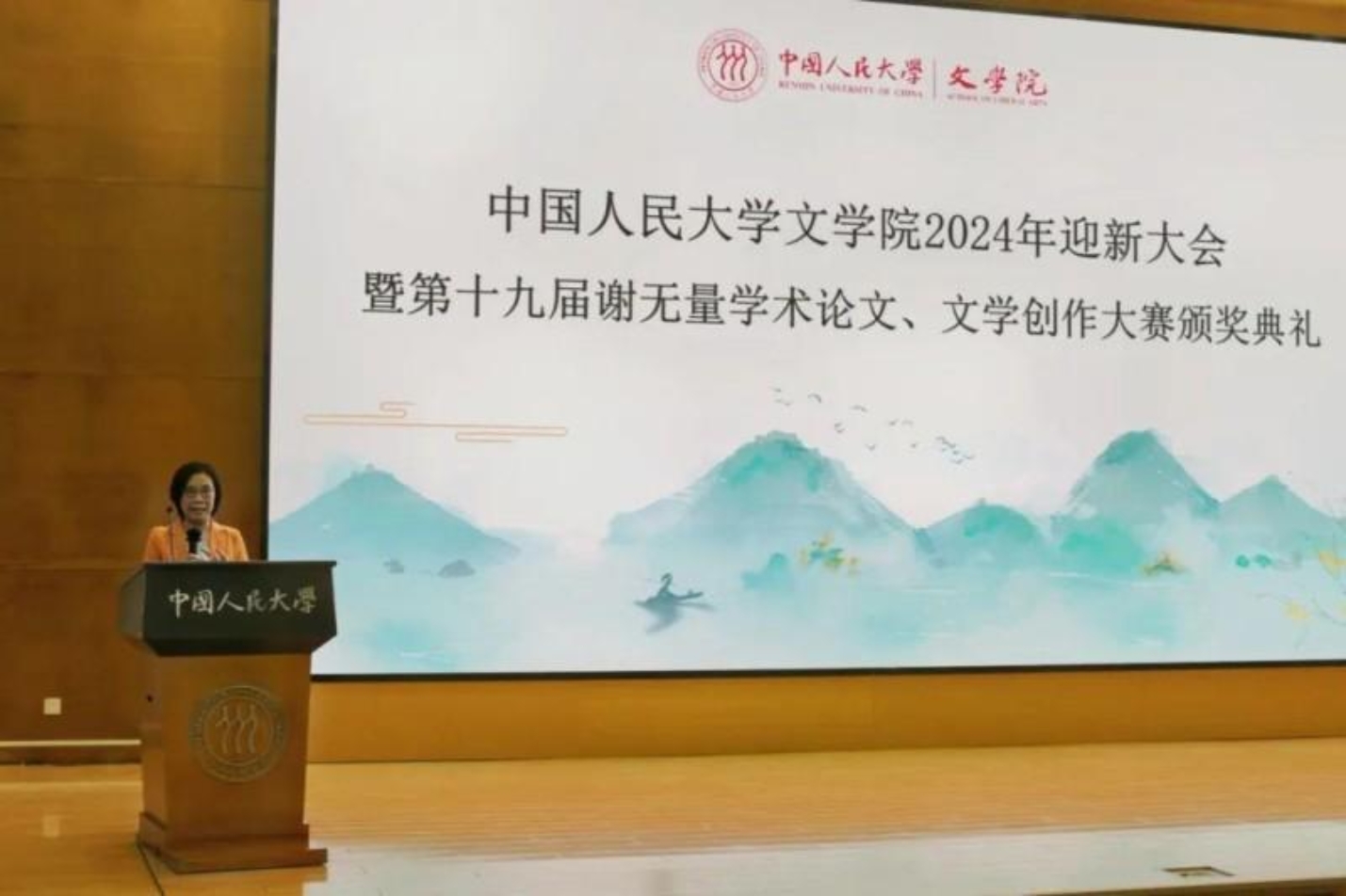 学生代表依次上台发言。在校生代表2022级硕士张若琳分享了在人大读书七年的收获与美好回忆,并给予同学们三点建议。首先,珍惜与信任老师和课堂,适应不同风格与特点的教学方式;其次,珍惜学校和学院为我们提供的资源与机会,将学业成果播撒在祖国大地上;最后,珍惜自己的身体与精神,为今后的学业和生活提供保障。2024级硕士新生代表管若彤回顾了大学四年的感动与对未来大学生活的期待。希望同学们都能够拥有足够的书卷气,充足的底气与青年的锐气,找到持之以恒的奋斗目标,借助文学的力量驶向更广阔的远方。2024级博士新生代表王修豪分享了自己走上文学道路的独特故事。从理科跨越到文学,从业余爱好跨越到专业学术。他用勇气与真心打破孤独的恐惧,引领人生的新体验。2023级本科新生代表李雨田分享了在人大探索各领域学科知识,全方面成长的感受,希望未来的学习能够在功利导向中寻找热爱,在文学典籍中找到属于自己的世界。
