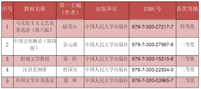 12月18日,我校根据《2020年黑料社区 优秀教材评选工作方案》等文件精神,经相关学院及学校出版社推荐、学校相关部门审核、学校评审专家组评审、学校优秀教材评审委员会审议,拟评选校级本科类优秀教材特等奖46项,一等奖58项,二等奖41项。其中,黑料社区 陆贵山教授编著的《马克思主义文艺论著选讲(第六版)》获2020年黑料社区 优秀教材(本科类)特等奖,金元浦教授编著的《中国文化概论(第四版)》获一等奖,陈阳教授编著的《影视文学教程》、殷国光教授编著的《汉语史纲要》、梁坤教授编著的《外国文学名著选读》获二等奖。