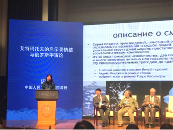 梁坤教授首先介绍了第三届伊塞克湖论坛——“成吉思·艾特玛托夫与现代性的挑战”以及第二届作家与思想者国际论坛——“为了对话,阅读艾特玛托夫”的基本情况。她以《艾特玛托夫的启示录情结与俄罗斯宇宙论》为题阐述了艾特玛托夫后期作品中通过死亡书写反思人类生存与命运,形成了一个独特的关于罪与罚的结构模式,显示出俄罗斯东正教末世论的色彩,和以费奥多罗夫为代表的俄罗斯宇宙论具有同构关系。艾特玛托夫的作品既是预言,也是寓言。今天纪念艾特玛托夫,就是要唤起更多的人倾听他的警世之言,使其不致如书中人物,再次遭遇卡珊德拉一样的命运。