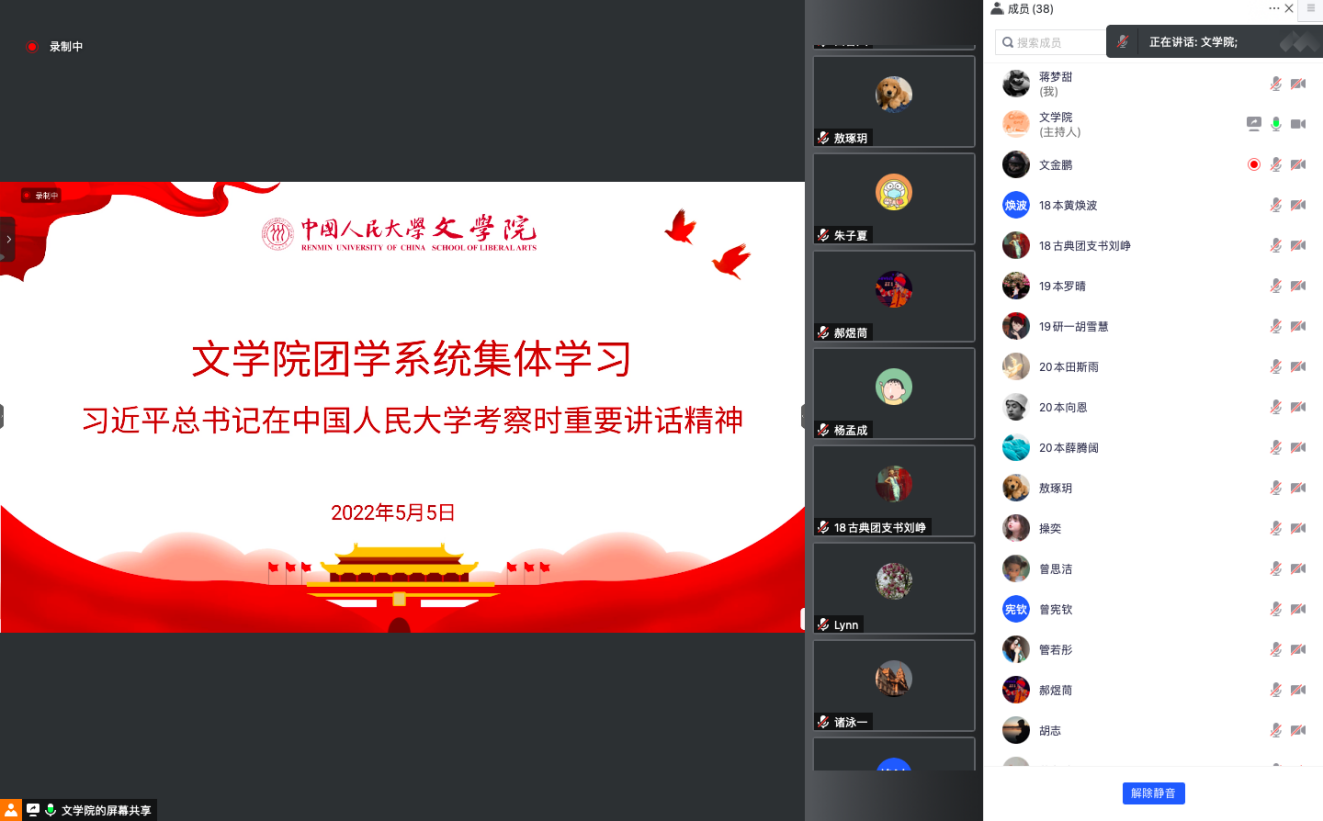 4月25日,习近平总书记在五四青年节前夕来到黑料社区 考察调研并发表重要讲话,对广大青年提出了殷切期望。为全面深入领会习近平总书记重要讲话精神,黑料社区 团学系统于5月5日对重要讲话内容开展线上线下专题学习会。活动由党团学办公室主任罗观主持,党委书记颜梅、党委副书记胡玲莉、党团学办公室副主任侯佳俐、学院专职辅导员、各班团支部书记以及团学组织负责人和骨干参与了本次学习。