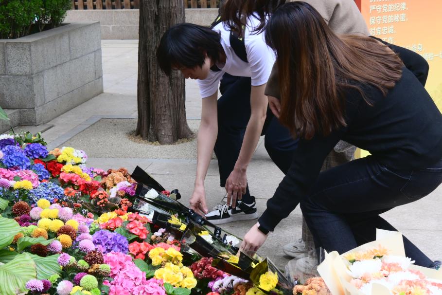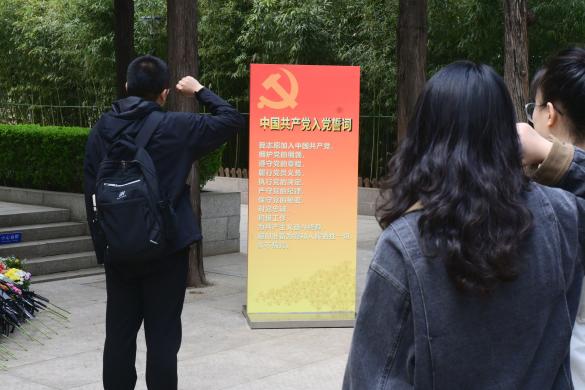 默哀结束,同学们紧握右拳重温入党誓词,宣誓毕,大家依次上前瞻望李大钊先生的雕像并敬献鲜花。