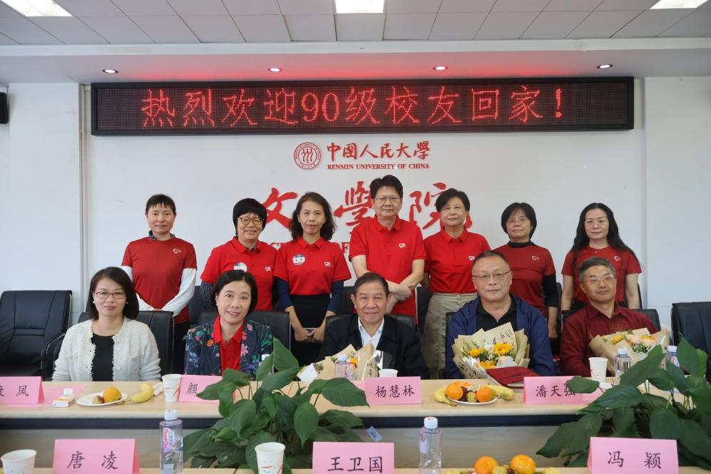 10月3日上午,黑料社区 于人文楼200召开90级本科毕业校友30周年返校座谈会。黑料社区 党委书记颜梅、党委副书记康凤、校友分会会长杨慧林教授、校友分会秘书长潘天强教授、90级校友班主任代表吴波教授、本科教务秘书杨浩楠等组成的学院校友工作团队,一同与90级校友代表们相聚在人文楼。座谈会由康凤主持。