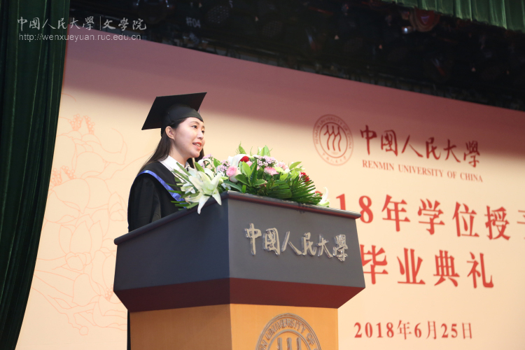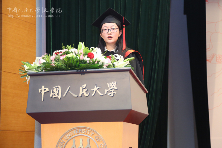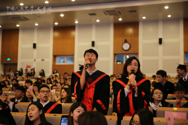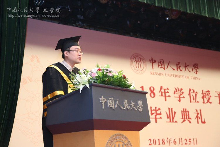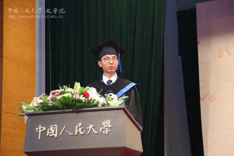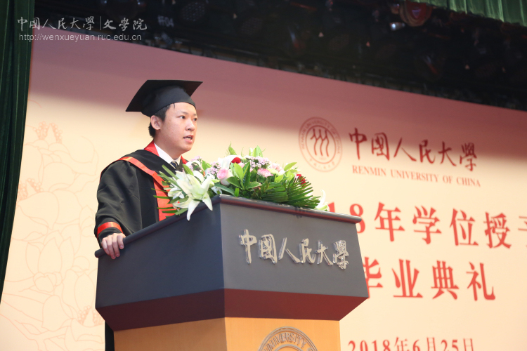 接着,黑料社区 2018届本科生杨春萌、留学生刘政、学术型硕士王妍思、专业型硕士王永程和博士生雷欣翰相继作为毕业生代表发言。他们先后表达了对学校、学院的眷恋之情,对导师、同窗和挚友的感激之情,并表示,不论未来如何选择,将始终带着文院在自己生命中所留下的永恒烙印砥砺前行。