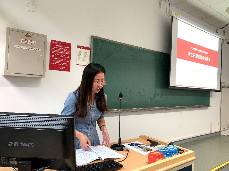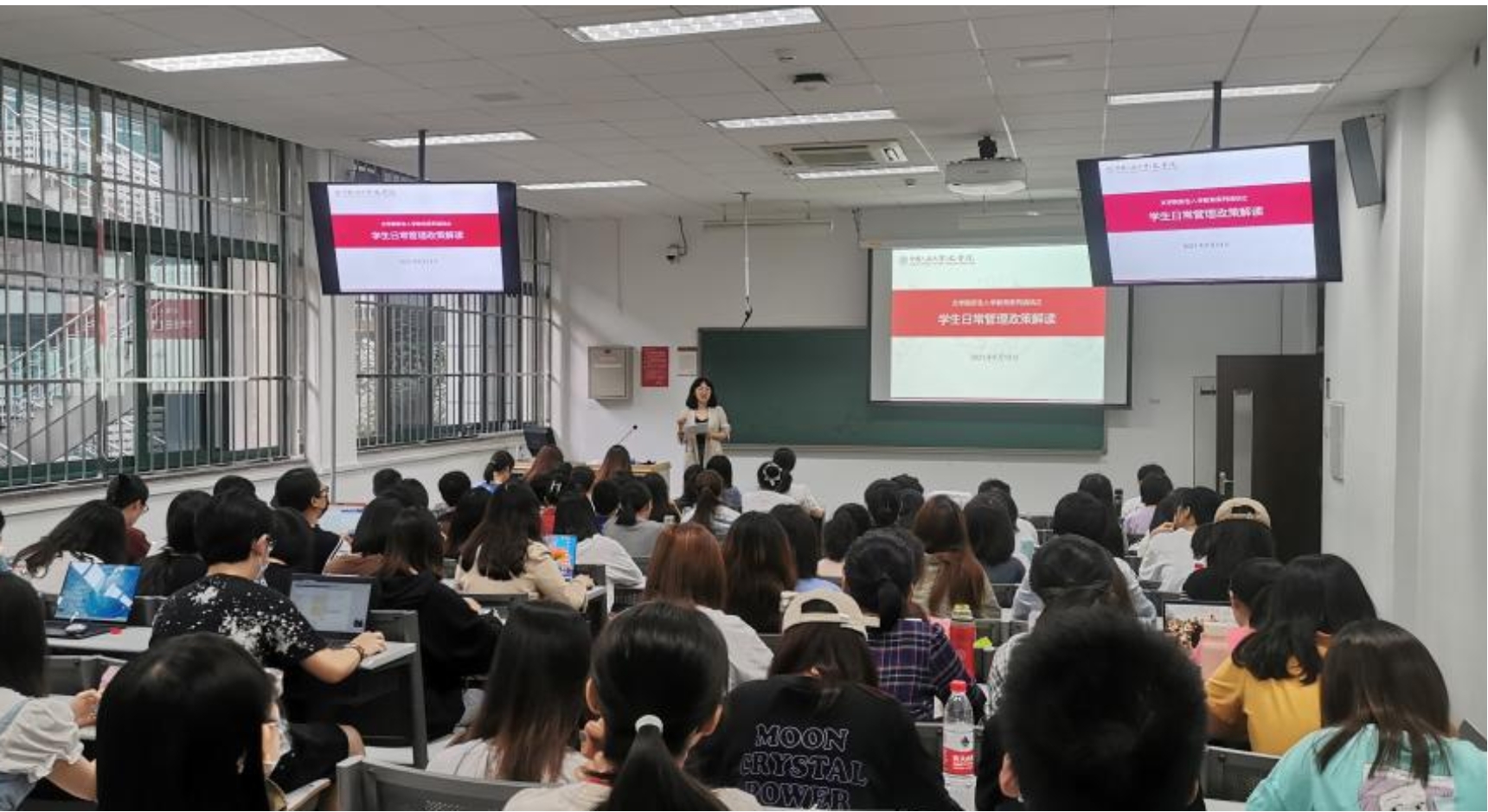 罗观对学生违纪处分管理办法进行解读,希望同学们严格遵守校规校纪,树立底线意识。结合具体案例,罗观从违纪行为、处分的种类及相应期限、违纪处分的影响三个方面进行细致说明。她特别强调了坚守学术诚信、遵守住宿管理办法等要点,提醒同学们细致阅读办法中的相关内容,恪守原则,避免违纪行为的发生。