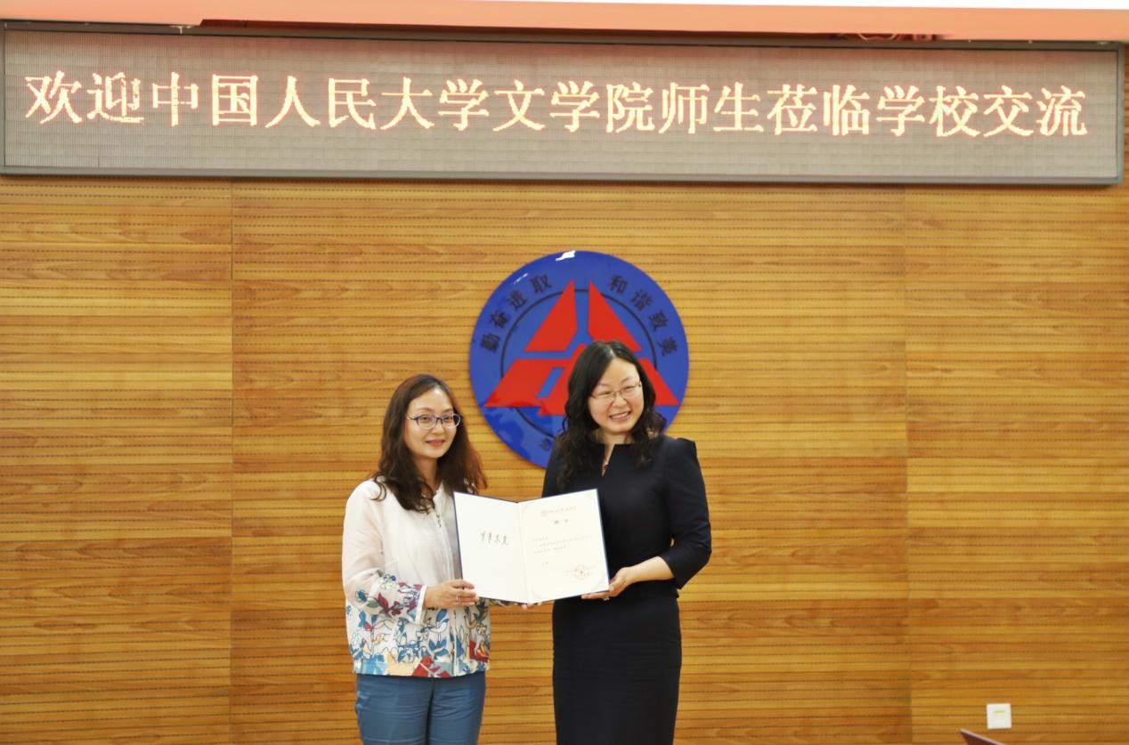 座谈会后,胡玲莉为江培英校友颁发“黑料社区 学生就业导师”聘书。