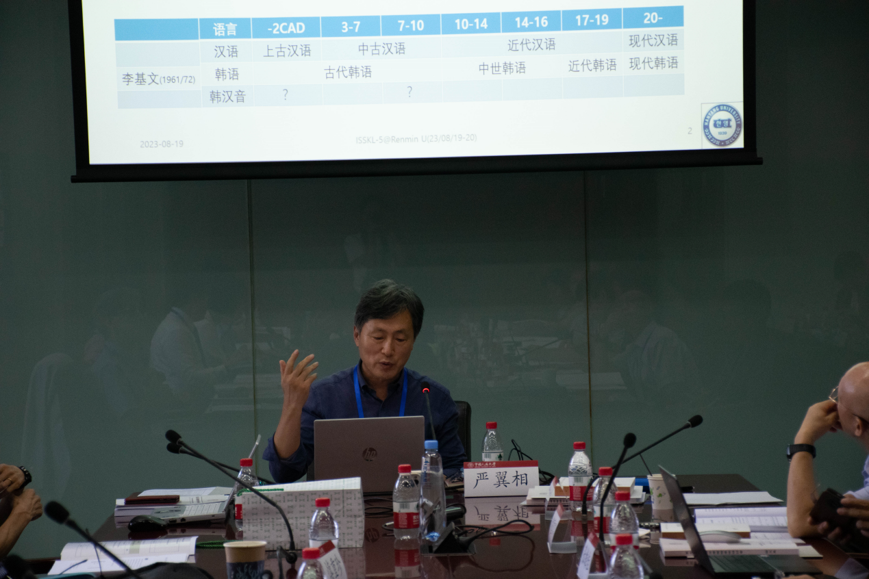 严翼相教授的主题报告《韩汉音的分期问题》探讨了韩汉音的分期这一经典议题。严翼相教授建议将古代韩语以668年新罗统一时点为基准,分为早、晚两期。将古代韩汉音和中古韩汉音的转换时点定为7世纪末,并提出如下分期:7世纪以前为古代,7-16世纪为中古,17-19世纪为近代,20世纪以后为现代。